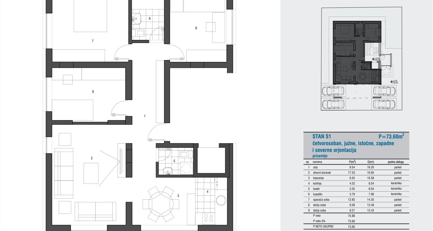 Četvorosoban – Prizemlje – južne, istočne, zapadne i severne orjentacije